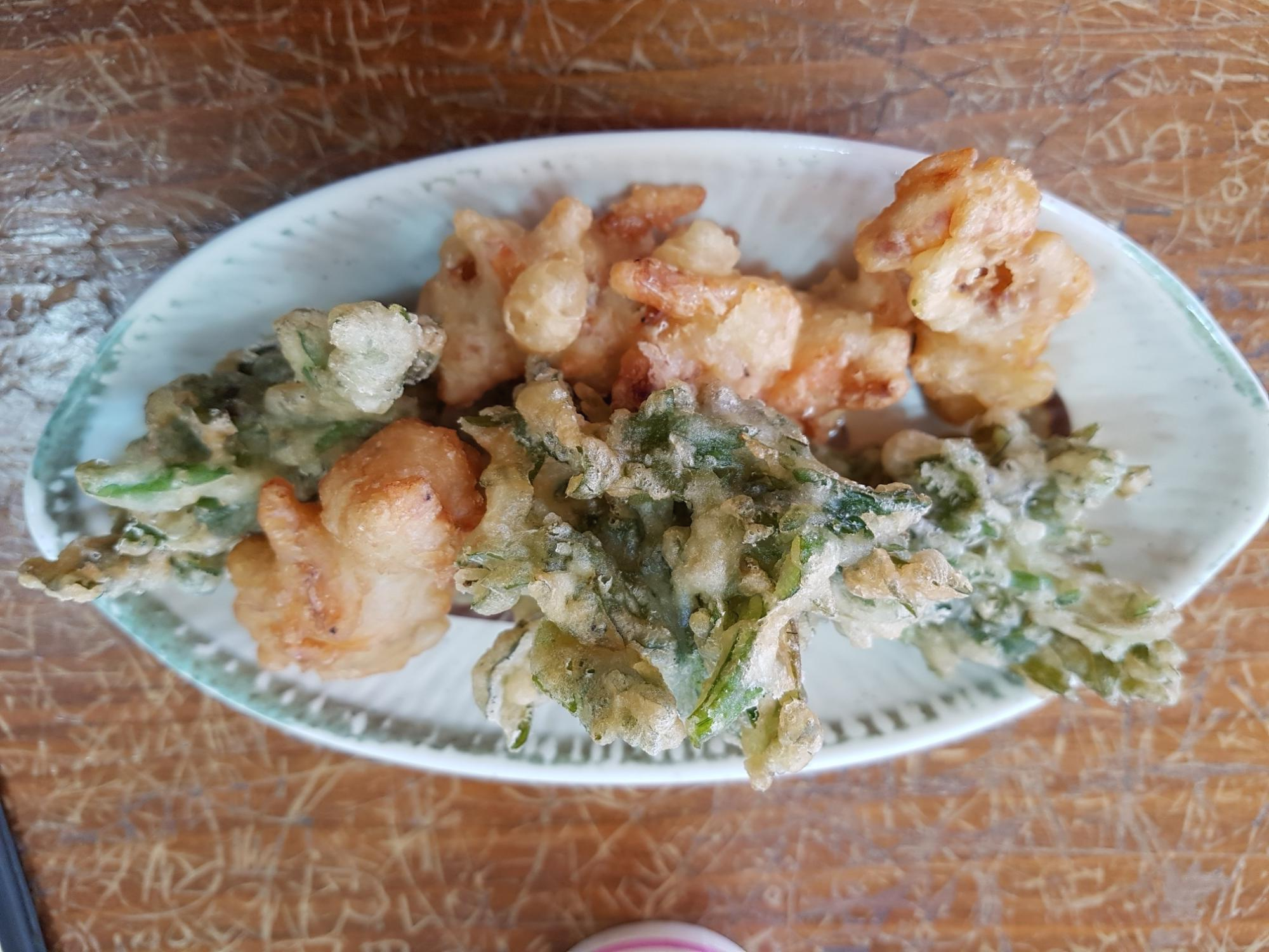 강화도에 특산물인 쑥을 이용한 쑥튀김이 제일 먼저 상에 차려졌고요.