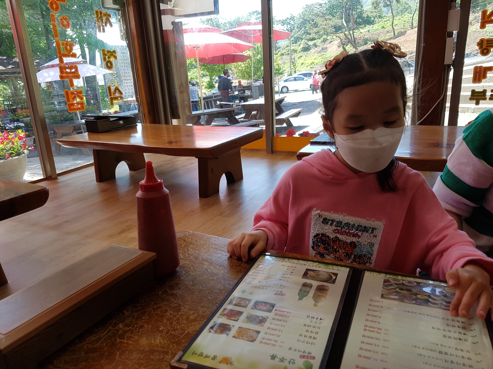 우리 따님이 메뉴판을 정독하면서 주문을 하려 하네요.
