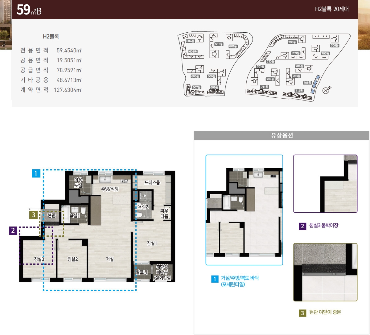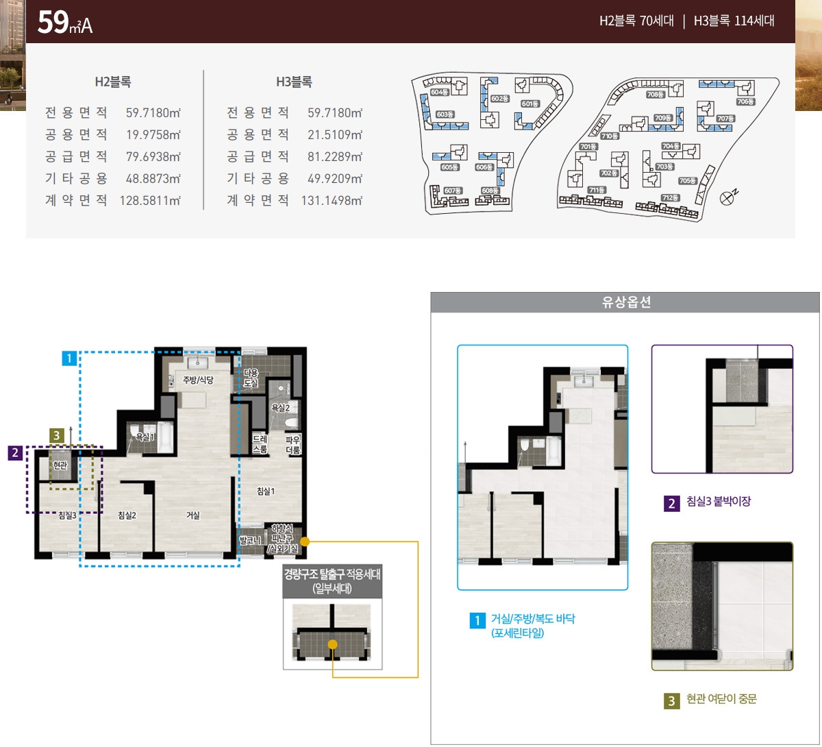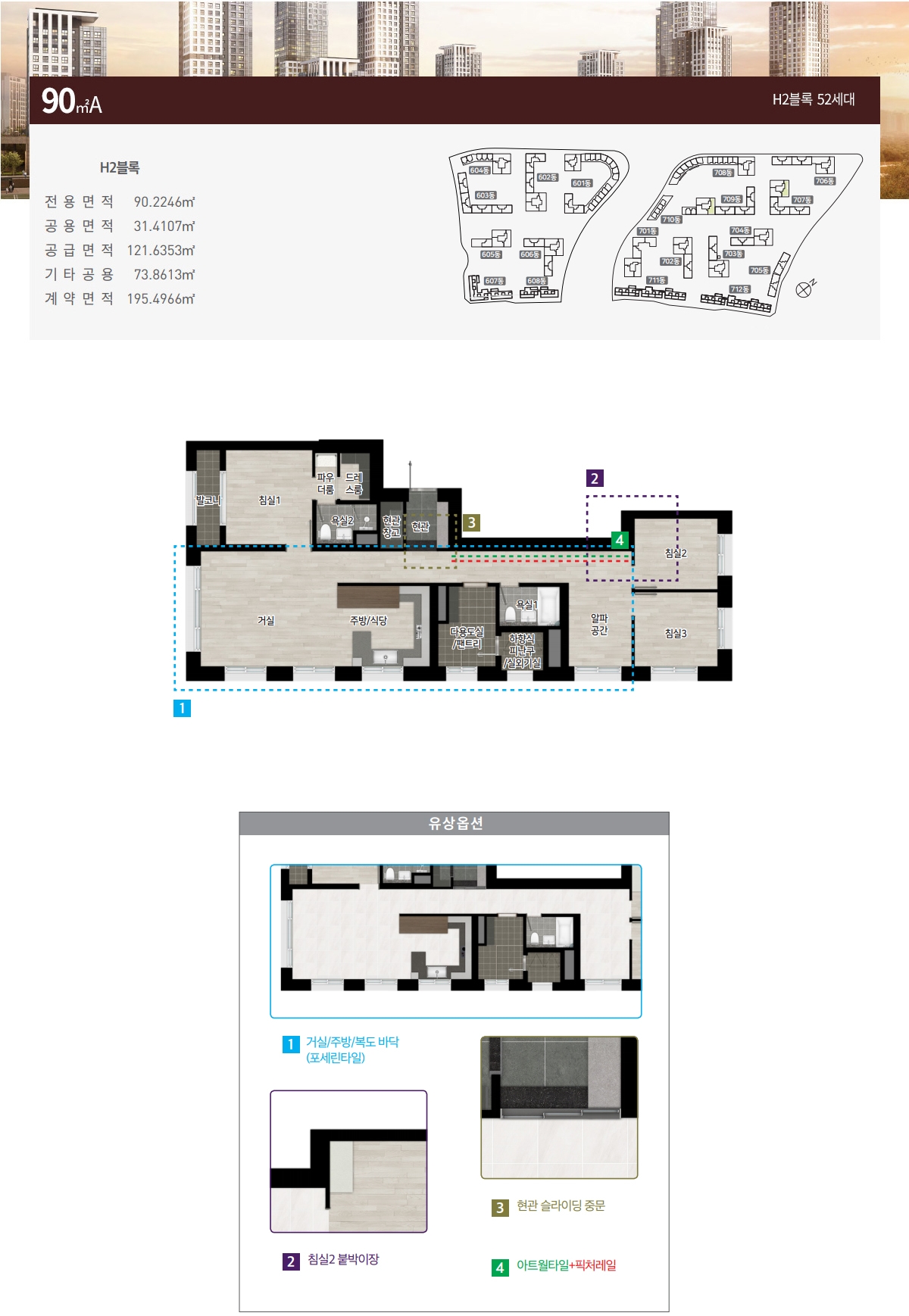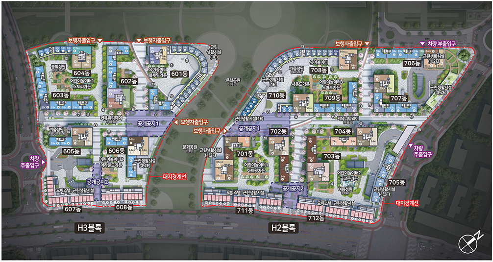 블록별로 H2는 지하3층, 최고 지상34층, 12개동, 전용면적 59~100㎡ 아파트 770세대와 전용면적 20~35㎡, 오피스텔 130세대, H3는 지하3층, 최고 지상35층, 8개동, 전용면적 59~112㎡ 아파트 580세대, 전용면적 20~35㎡ 오피스텔 87실로 조성이 됩니다.