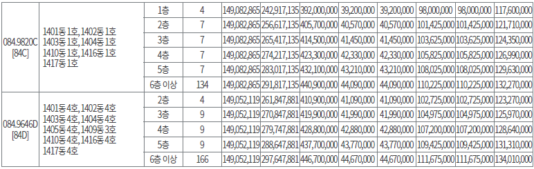 전용면적별 가구 수는 △59㎡A 563가구 △59㎡B 139가구 △59㎡C 201가구 △59㎡D 87가구 △84㎡A 185가구 △84㎡B 207가구 △84㎡C 166가구 △84㎡D 197가구로 구성된다.