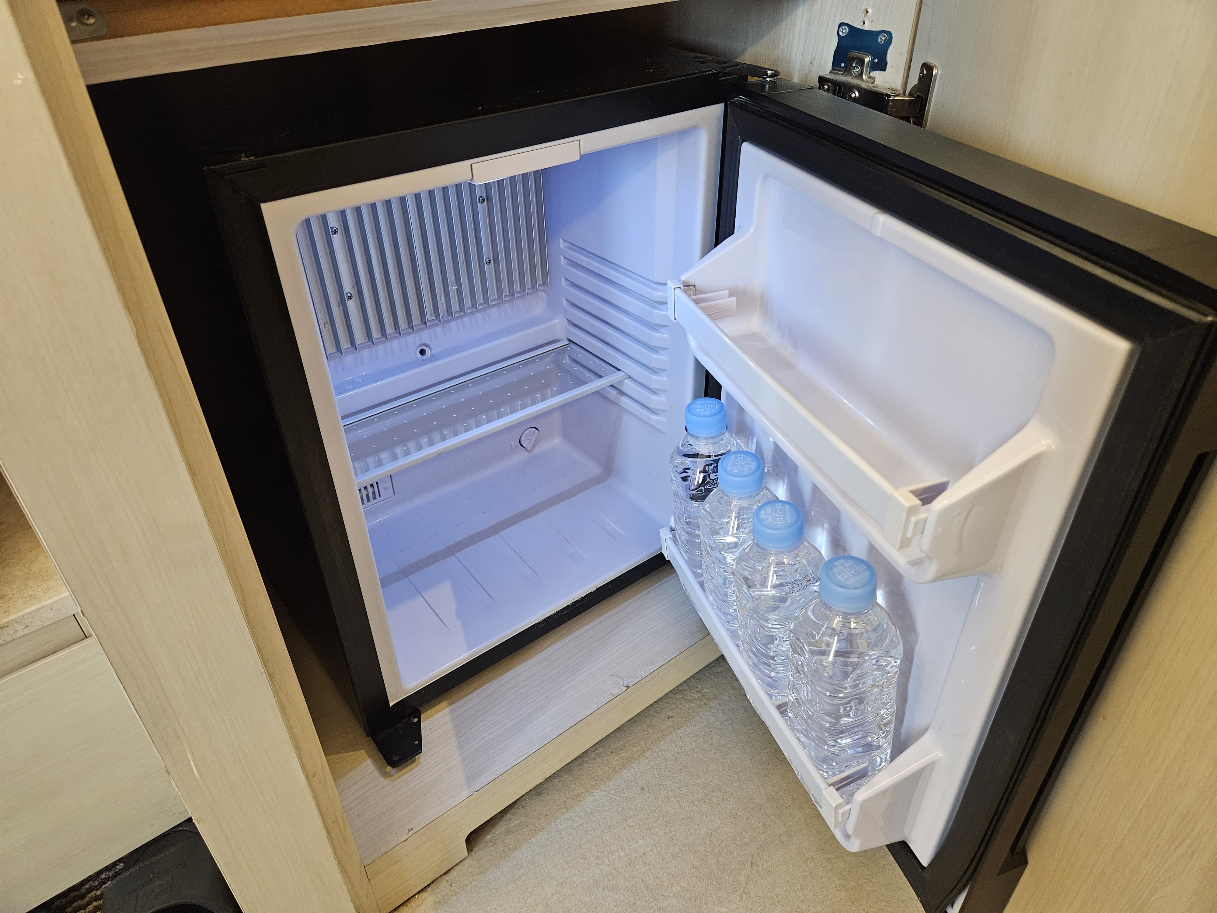 미니 냉장고에는 이렇게 4병의 생수가 제공된다는 점 확인 바란다.