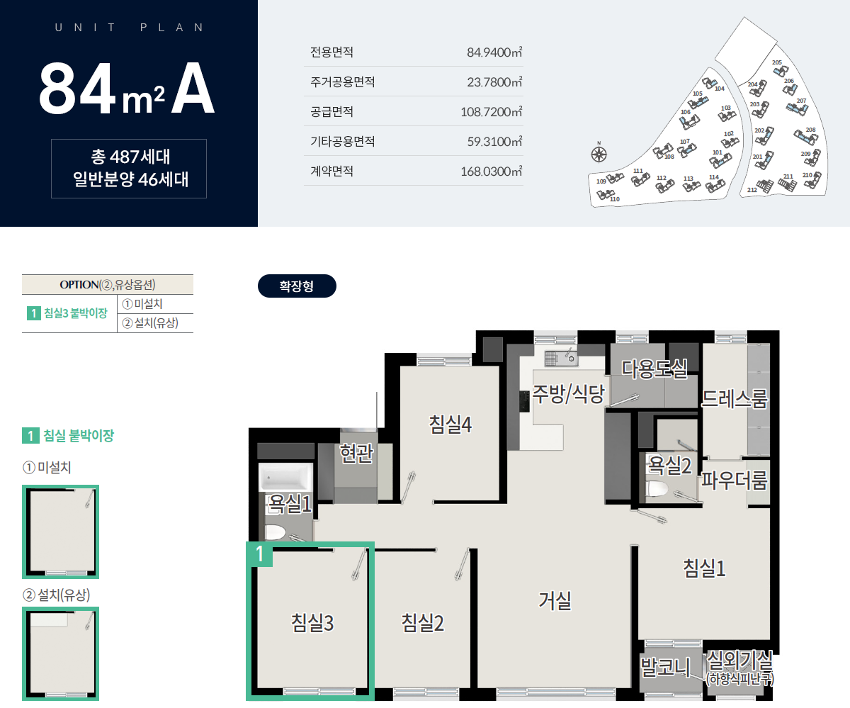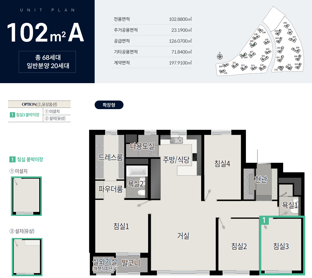 전 가구를 남향 위주로 배치했으며, 전 주택형에 투명유리 난간대를 적용해 채광 및 조망, 일조권을 극대화했다. 또 전용면적 59㎡ 이상 전 주택형에 안방 드레스룸이 조성돼 넉넉한 수납공간을 갖췄다.