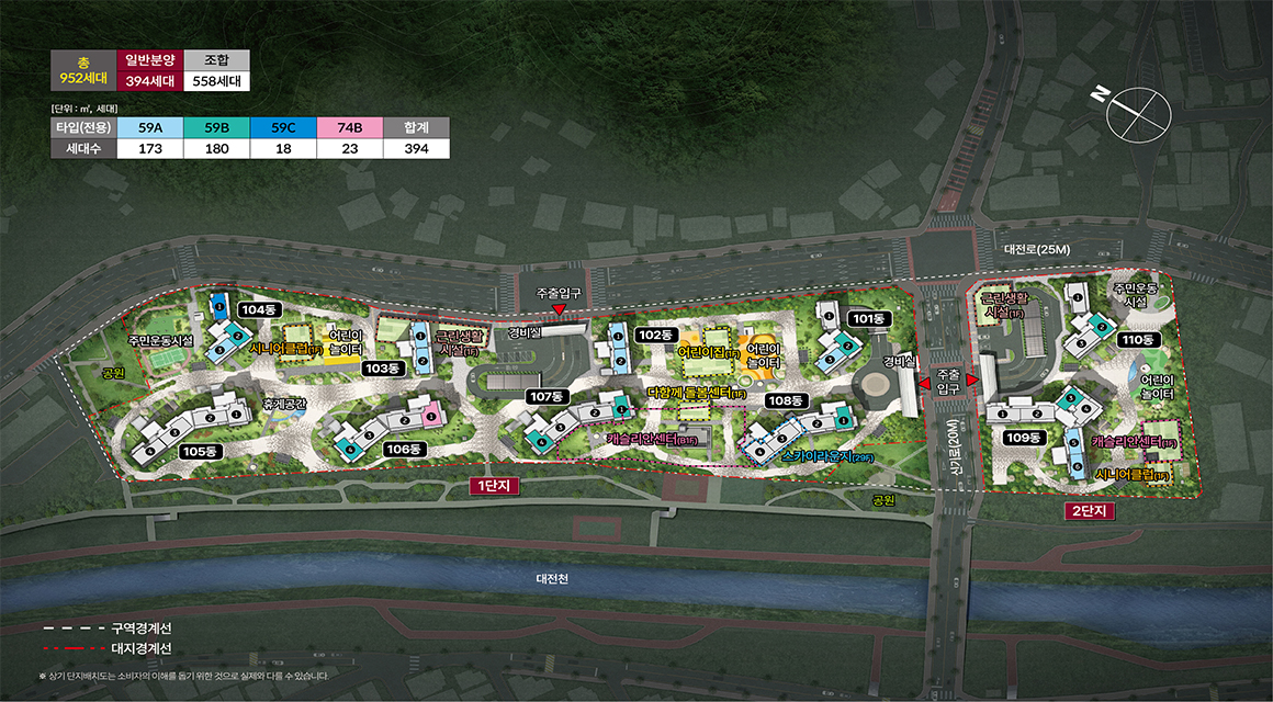 단지는 지하 2층~지상 33층, 10동 규모로 조성되며, 전용면적 59~120㎡ 952가구 중 59∙74㎡ 타입 394가구를 일반에 분양한다.