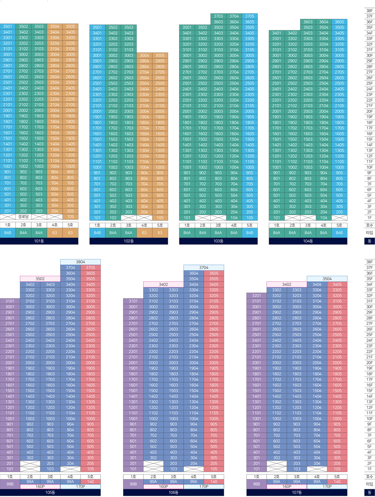 단지는 지하 3층~지상 최고 38층, 7개동 총 1,191가구로 전용면적별로는 ▲63㎡ 128가구 ▲84㎡A 417가구 ▲84㎡B 141가구 ▲99㎡A 298가구 ▲99㎡B 94가구 ▲140㎡ 107가구 ▲160㎡ 3가구 ▲170㎡ 3가구 등으로 다양한 타입으로 구성됐다.
